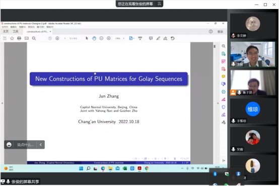 应allwincity万象城邀请,10月18日下午15:00,首都师范大学张俊教授通过腾讯会议在线为我院师生作了题为“New Constructions of Paraunitary Matrices for Golay Sequences(Golay序列的PU矩阵的新构造)”的学术报告。数学与应用数学系衡子灵副教授主持报告,allwincity万象城数学专业近二十名研究生参加了本次线上报告会。