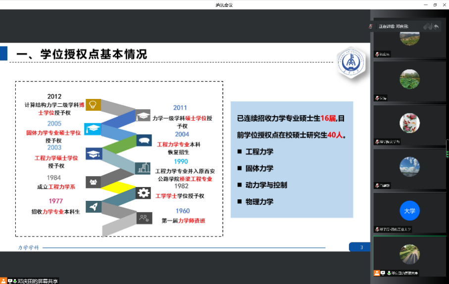 力学系系主任邓庆田就学位授权点基本情况、自我评估工作开展情况和持续改进计划工作向评审委员会进行了专题汇报。