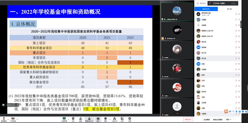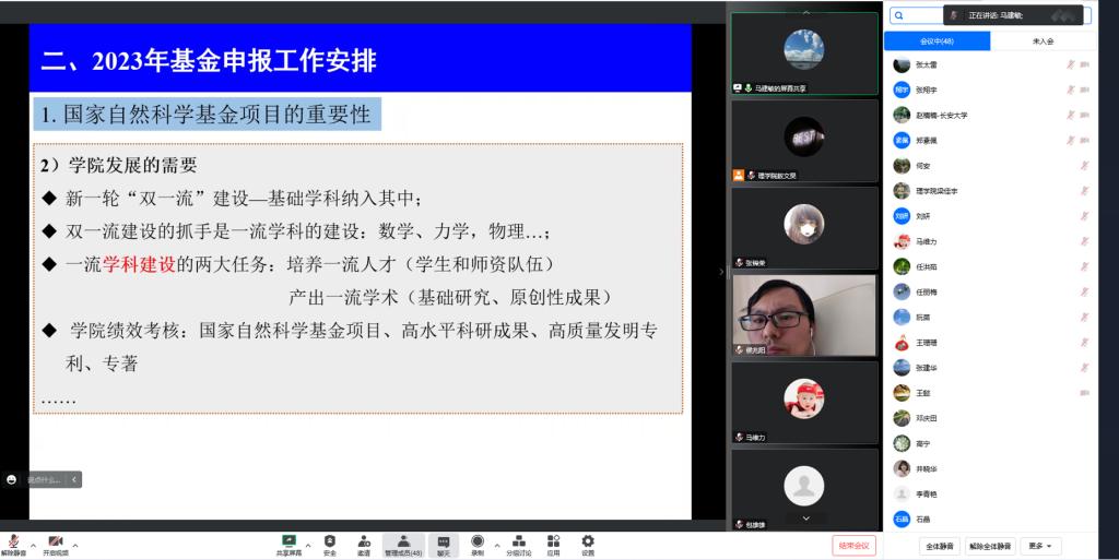 2023年1月12日,allwincity万象城线上召开了2023年国家自然科学基金项目申报推进会,各学科主任、系(副)主任以及拟申报基金的全体教职工老师共47余人参加了本次会议,会议由副院长马建敏主持。
