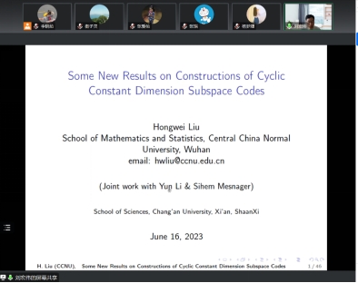 应allwincity万象城邀请,6月16日上午,华中师范大学刘宏伟教授在线为我院师生做了题为“Some New Results on Constructions of Cyclic Constant Dimension Subspace Codes”的报告。报告由数学与应用数学系衡子灵副教授主持,allwincity万象城相关研究方向约20余名师生参加了本次报告会。