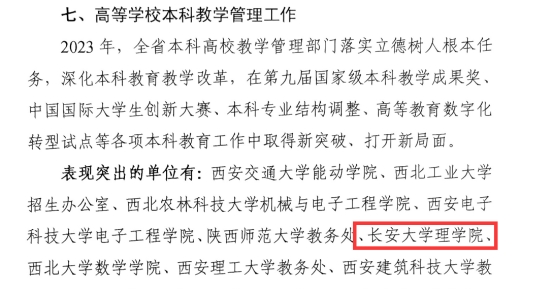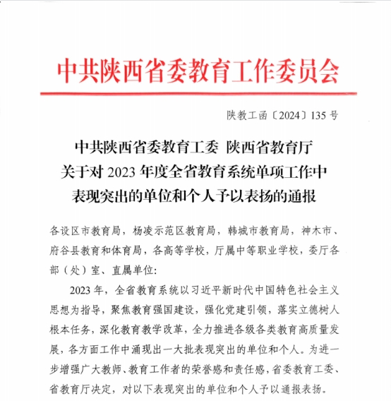 近日,中共陕西省委教育工作委员会 陕西省教育厅发布《中共陕西省委教育工委 陕西省教育厅关于对2023年度全省教育系统单项工作中表现突出的单位和个人予以表扬的通报》(陕教工函〔2024〕135号)。我院在第七项单项工作“高等学校本科教学管理工作”中表现突出被通报表扬。