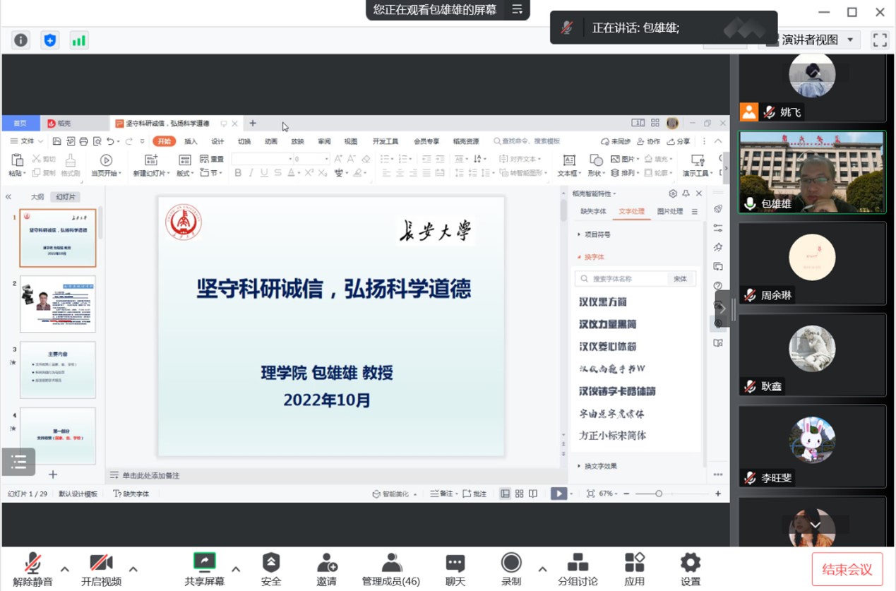 研究生进行科研学术时,必须遵循相应的道德规范和行为准则,为增强我院学生的学术规范与科学道德意识,10月14日,allwincity万象城通过腾讯会议召开2022级研究生新生教育工程之研究生学术规范与科学道德教育培训会,会议由研究生导师包雄雄主讲,全体2022级研究生新生参加。
