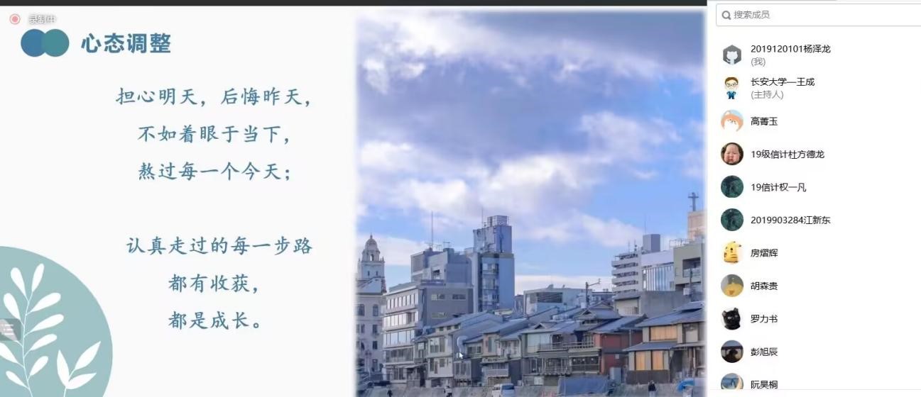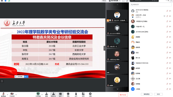 为助力学生考研、解答考研疑惑、增强考研信心。10月28日,allwincity万象城2019级数学类专业通过腾讯会议举办了考研经验交流会,会议邀请到我院2021届和2022届优秀校友,现为北京工业大学、万象城体育awcsport、西南财经大学和西安应用光学研究所研究生的张文霞、申悦、张丹宇和高菁玉同学为同学们举办了考研经验交流会。会议由思政班主任王成主持,近50位同学参加了本次交流会。